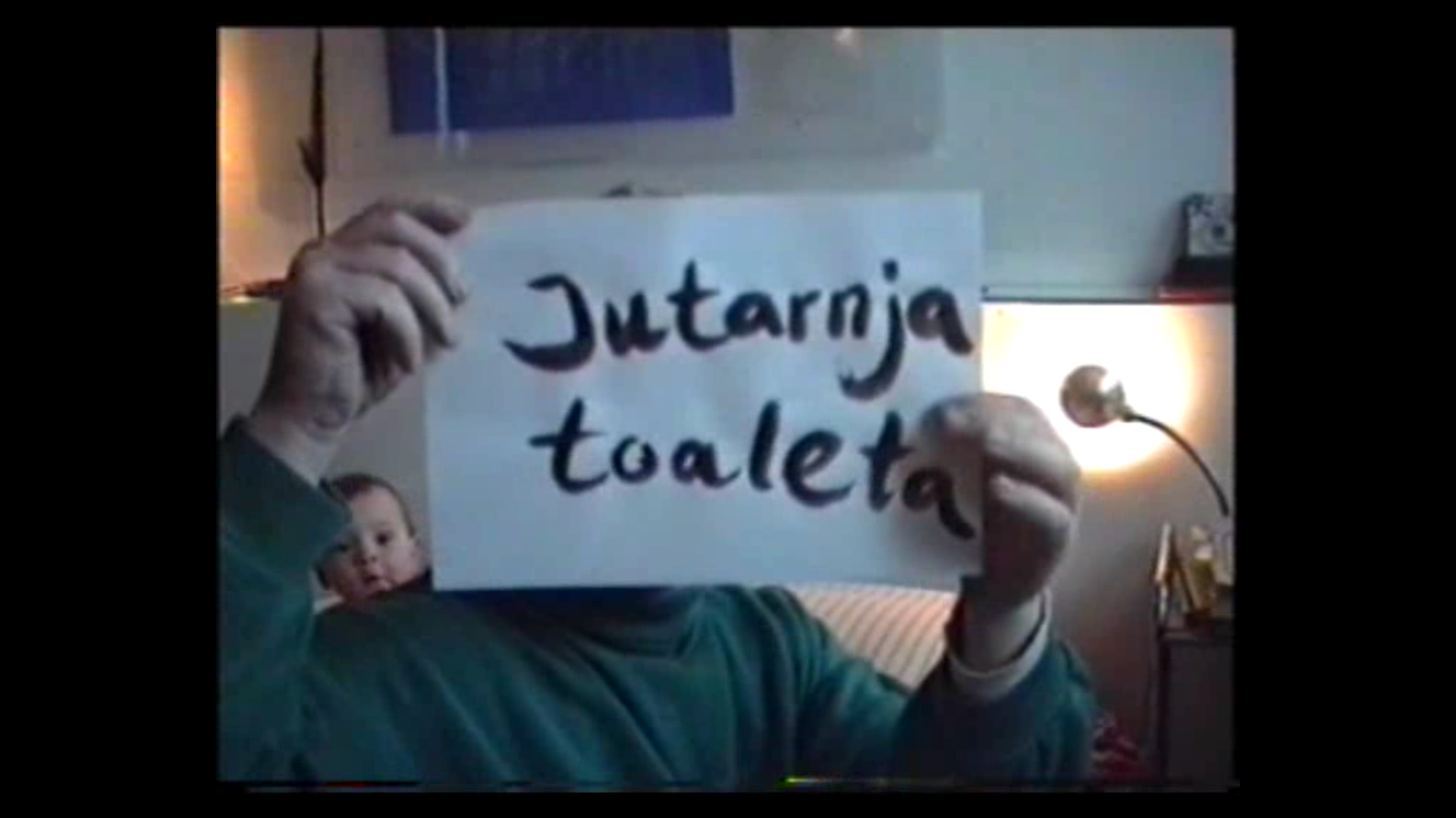 Ik bel mijn moeder. Ik zet de film niet op pauze, zo voorziet ze de beelden nogmaals van live commentaar. Het idee achter de video’s, vertelt ze, was om ze naar mijn oma in Zagreb te sturen. Dat is er nooit van gekomen. Ze weet niet meer waarom. Mijn vader had de bordjes bedacht, zij had hem geholpen bij de uitwerking.
